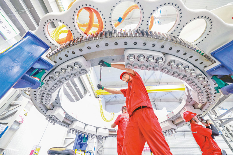 党的二十届三中全会强调要建设一流产业技术工人队伍。产业工人是工人阶级的主体力量,各级工会要更好团结动员广大职工为进一步全面深化改革、推进中国式现代化作贡献。图为2024年7月23日,河北省隆化县一家风电设备企业的工人在车间工作。